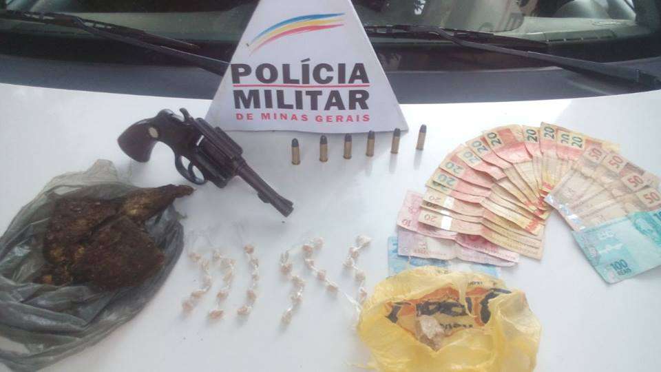 Já por volta das 15h30, durante patrulhamento pela Praça Presidente Getúlio Vargas, no bairro Triângulo, militares avistaram o momento em que um indivíduo, de 32 anos, fazia contato com outro cidadão, de 28 anos, sendo este envolvido com o tráfico ilícito de drogas. Militares continuaram o policiamento, realizando monitoramento à distância, momento que avistaram um dos indivíduos se afastando do Terminal Rodoviário, neste instante militares o abordaram e durante a busca pessoal foi encontrado com ele três pedras de crack escondidas debaixo da língua. Em continuidade, realizaram patrulhamento nas proximidades e depararam com o outro indivíduo, sendo procedida abordagem e encontrado com este cerca de R$ 249,50. Diante de informações de que ele estaria comercializando drogas com um outro indivíduo, e que este estaria escondido em uma casa, militares deslocaram juntamente com este até a residência, onde a entrada foi franqueada sendo encontrado neste local o jovem, sendo encontrado em sua cintura um revólver calibre 38 com seis cartuchos intactos, bem como uma mochila com objetos pessoais e uma sacola contendo uma barra de maconha, uma pedra maior e 30 pedras menores de crack e a quantia de R$ 330,00 em moeda corrente. Os autores foram presos e encaminhados para a Delegacia de Polícia, juntamente com o material apreendido.