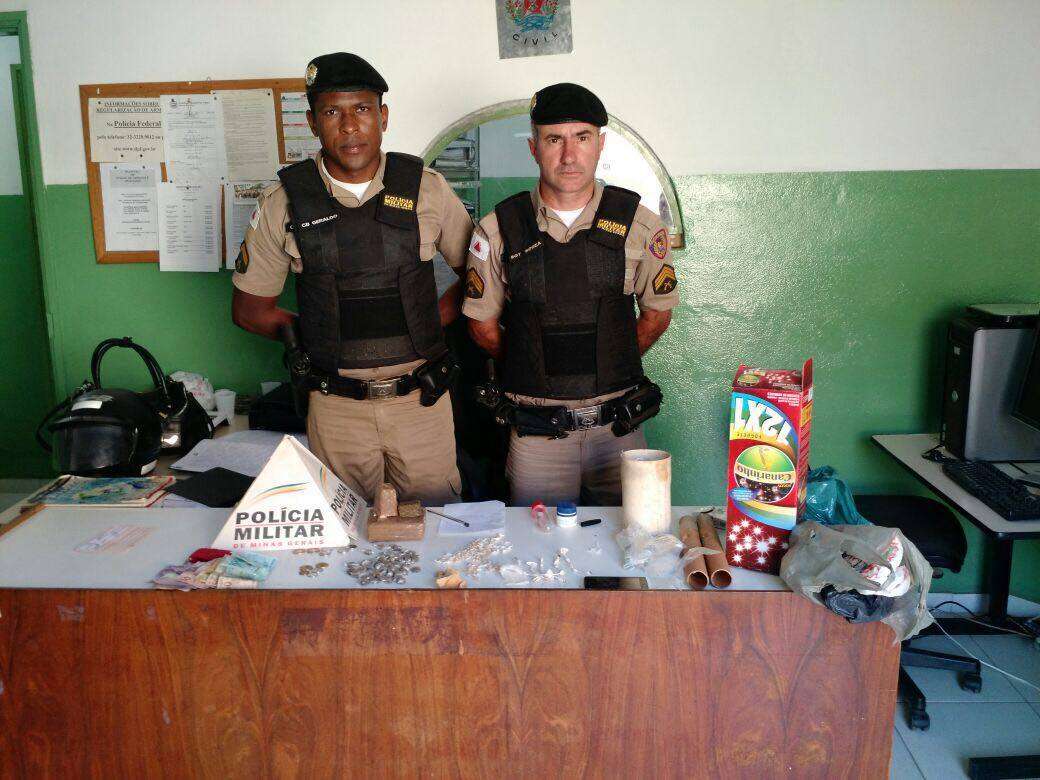 Após busca pessoal, foi localizada com o mesmo a quantia de R$ 379,90 em moeda corrente, sendo R$ 350,00 em dinheiro e R$ 4,90 em moedas. Ao verificarem a sacola dispensada, os policiais encontraram em seu interior 108 invólucros e quatro pedras de crack, 51 invólucros e três tabletes de maconha e 28 sacolés de cocaína.