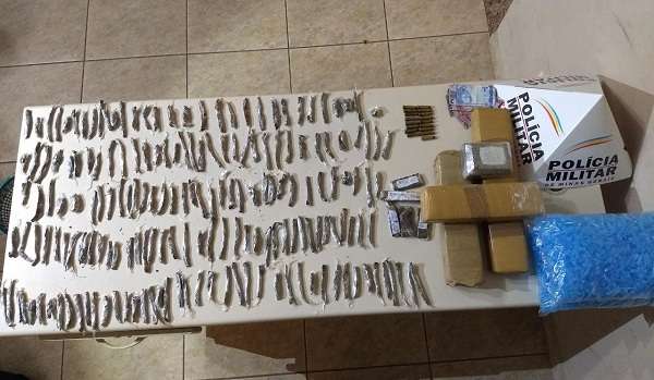 Após buscas na residência do infrator, foram encontrados os seguintes materiais: 180 buchas de maconha prontas para a venda; três barras e meia grandes de maconha (aproximadamente 3 kg da droga); cinco tabletes maiores de maconha prontos para a venda; 17 munições intactas calibre 38; 2.000 pinos vazios utilizados para embalar drogas; a quantia de R$ 17,00.