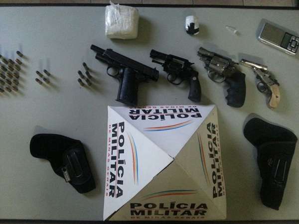No imóvel, após buscas, foi localizada uma pistola 380, semiautomática, carregada com sete cartuchos intactos, um revólver calibre 38, carregado com cinco cartuchos intactos, um revólver calibre 32, carregado com quatro cartuchos intactos, uma garrucha de dois canos desmuniciada, dois coldres de revólver, 15 cartuchos de pistola 380, dois tabletes de cocaína e uma balança de precisão.