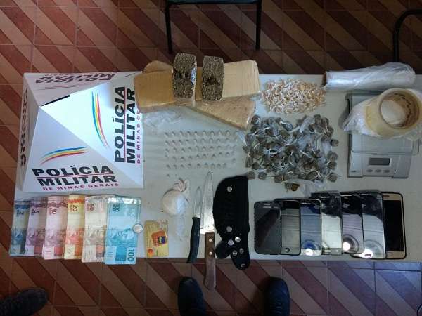 Foram realizadas buscas nos autores, no comércio, em um sobrado vizinho e em um matagal situado em frente ao estabelecimento, sendo localizadas 85 buchas de maconha, duas barras e dois tabletes da substância, 51 pinos de cocaína, uma porção grande da mesma substância, 105 pedras de crack, 18 pinos vazios, duas facas com resquícios de substâncias entorpecentes, uma balança de precisão, um coldre, um aparelho televisor de 14 polegadas conectado a uma câmera de vigilância e a quantia de R$ 3.020,50.