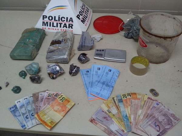 Na parte externa do imóvel, em um terreno aberto, a cerca de quarenta metros da residência do adolescente, foi localizado enterrado um balde, contendo em seu interior cinco invólucros de crack, uma balança eletrônica de precisão, há cerca de dois metros de onde foi localizado o balde, foram encontradas duas barras e um tablete de maconha.