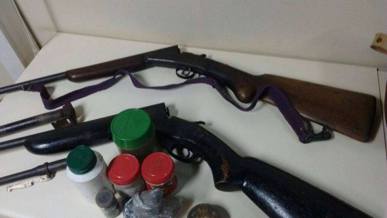 Momentos depois, na mesma localidade, a PM foi checar outra informação que dava conta de que indivíduos armados estariam por uma mata. Após buscas, os militares lograram êxito e apreenderam uma espingarda calibre 32, duas munições calibre 38, cinco cartuchos calibre 32, oito cápsulas calibre 32, dois cartuchos calibre 28, duas cápsulas calibre 28, dois trabucos, 50 espoletas, dois cintos porta cartuchos, uma bolsa de couro e material para recarga (pólvora e chumbo). O proprietário do material não foi localizado.
