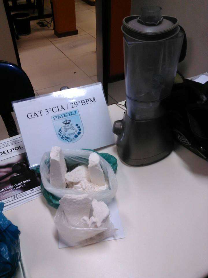 Policiais do GAT da 3°CIA do 29°BPM, em patrulhamento pela Rua Deputado Luiz Fernando Linhares, Centro, avistaram o autor em atitude suspeita saindo do Campo Municipal. A guarnição já havia recebido informações de que o mesmo seria o funcionário responsável pelo campo e que utilizava o local para realizar tráfico de entorpecentes. Os policiais encontraram, durante revista pessoal, uma mochila com um liquidificador e no interior do campo uma grande pedra de material aparentando ser cocaína.