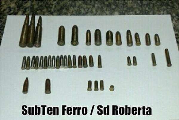 Já nesta segunda-feira (27), policiais em deslocamento pela Rua General Osório, Centro, avistaram um elemento moreno trajando bermuda e camisa escura em um beco em atitude suspeita e ao fazer o retorno para chegar ao local não mais o encontrou. No entanto, ao fazerem buscas pelo local, encontraram uma sacola plástica com 35 munições intactas, sendo: 3 de calibre 7,62; 2 de calibre 44; 2 de calibre 45; 4 de calibre 32; 1 de calibre 380; 1 de calibre 7,63; 2 de calibre 7,65; 3 de calibre 6,35; 17 de calibre 22; 1 de calibre 5.5. O material foi conduzido à Delegacia de Polícia.