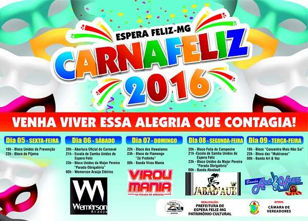 A Prefeitura de Espera Feliz divulgou a programação do Carnaval 2016, que acontece entre os dias 5 e 9 de fevereiro.