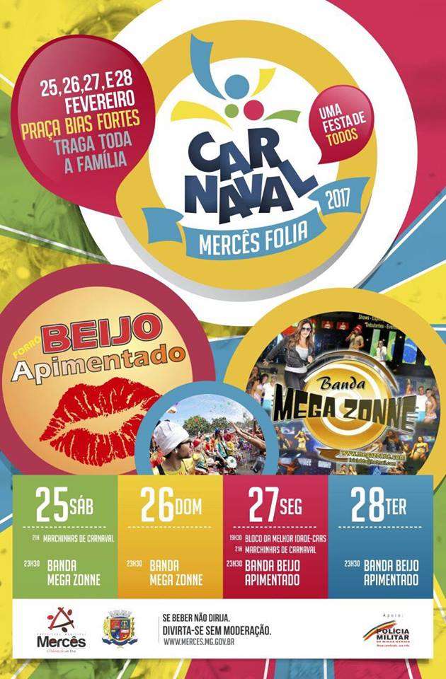 A Prefeitura de Mercês divulgou a programação do Carnaval 2017, que acontece entre os dias 25 e 28 de fevereiro na Praça Bias Fortes.
