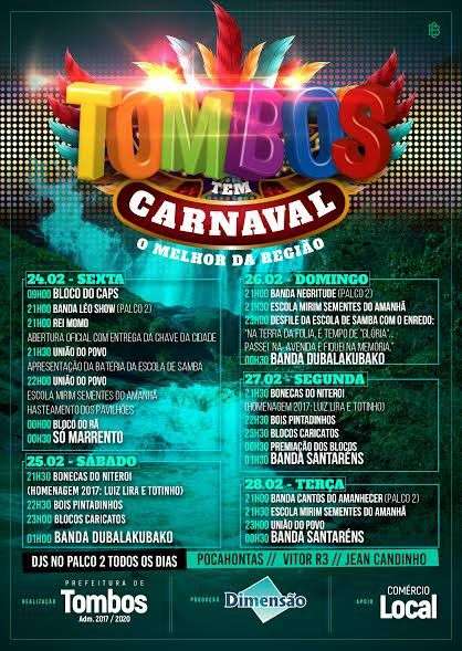 A Prefeitura de Tombos divulgou a programação do Carnaval 2017. A festa acontece entre os dias 24 e 28 de fevereiro.