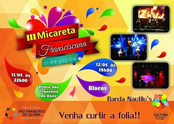 A Prefeitura de São Francisco do Glória divulgou a programação da 3ª Micareta Franciscana, que acontece nos dias 11 e 12 (sábado e domingo) de abril de 2015, na Praça São Francisco de Assis.