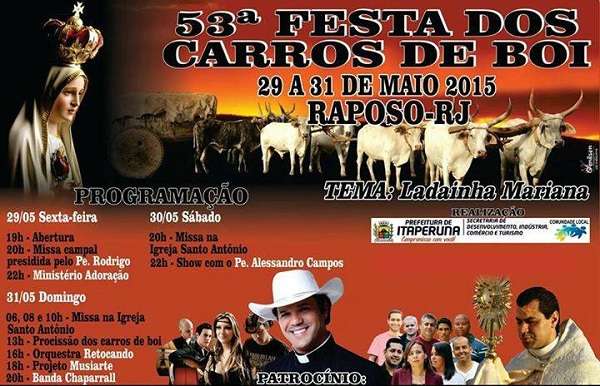 Será realizada, entre os dias 29 a 31 de maio, a 53ª Festa dos Carros de Bois de Raposo, distrito de Itaperuna. Este ano o tema será “Ladainha Mariana”.