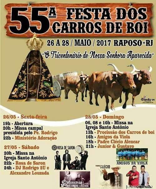 A 55ª Festa dos Carros de Boi de Raposo será realizada, no distrito de Itaperuna, entre os dias 26 e 28 de maio de 2017. Este ano, a festa terá como tema “O Tricentenário de Nossa Senhora Aparecida”.