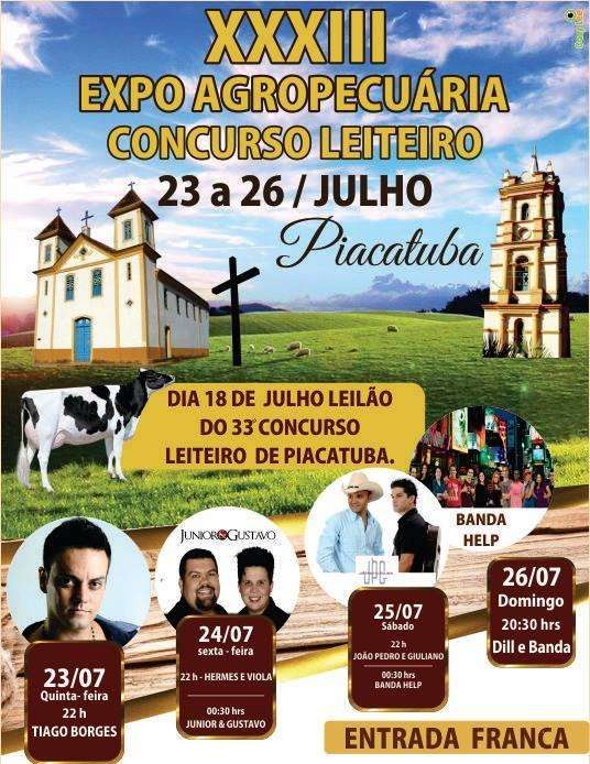 A 33ª Exposição Agropecuária de Piacatuba, distrito de Leopoldina, começa nesta quinta-feira (23) e segue até domingo (26). A entrada é franca.