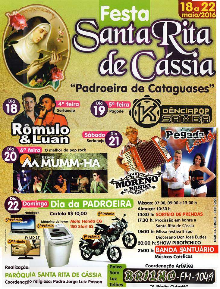 A cidade de Cataguases celebra, de 18 a 22 de maio, Santa Rita de Cássia, padroeira do município.