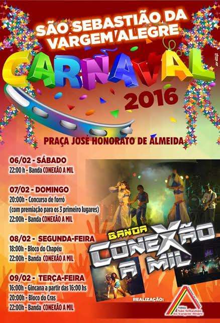 A Prefeitura de São Sebastião da Vargem Alegre divulgou a programação do do Carnaval 2016. A festa será realizada na Praça José Honorato de Almeida, entre os dias 6 e 9 de fevereiro.