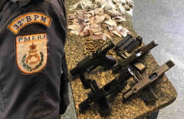 A PM apreendeu no local quatro pistolas calibre 9mm, seis radiotransmissores, 44 munições de calibre 9mm intactas, 9 munições de calibre 9 mm deflagradas, 309 papelotes de cocaína, 226 buchas de maconha, 85 buchas de haxixe e um caderno com supostas anotações do tráfico de drogas.