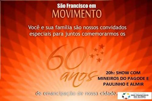O município de São Francisco do Glória comemora nesta quinta-feira (12) 60 anos de emancipação política administrativa. A comemoração da data se inicia a partir de meio-dia, na Praça São Francisco de Assis, e segue durante o restante do dia.