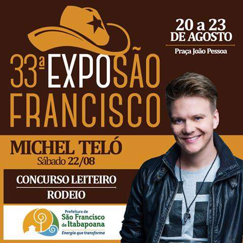 O cantor Michel Teló é a atração mais esperada da 33ª Exposição de São Francisco de Itabapoana, que acontece de 20 a 23 de agosto, na Praça João Pessoa. A entrada é franca.