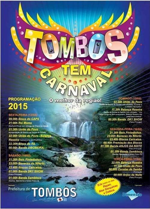 A Prefeitura de Tombos divulgou a programação do Carnaval 2015. A folia começa nesta sexta-feira (13) e segue até terça-feira (17).