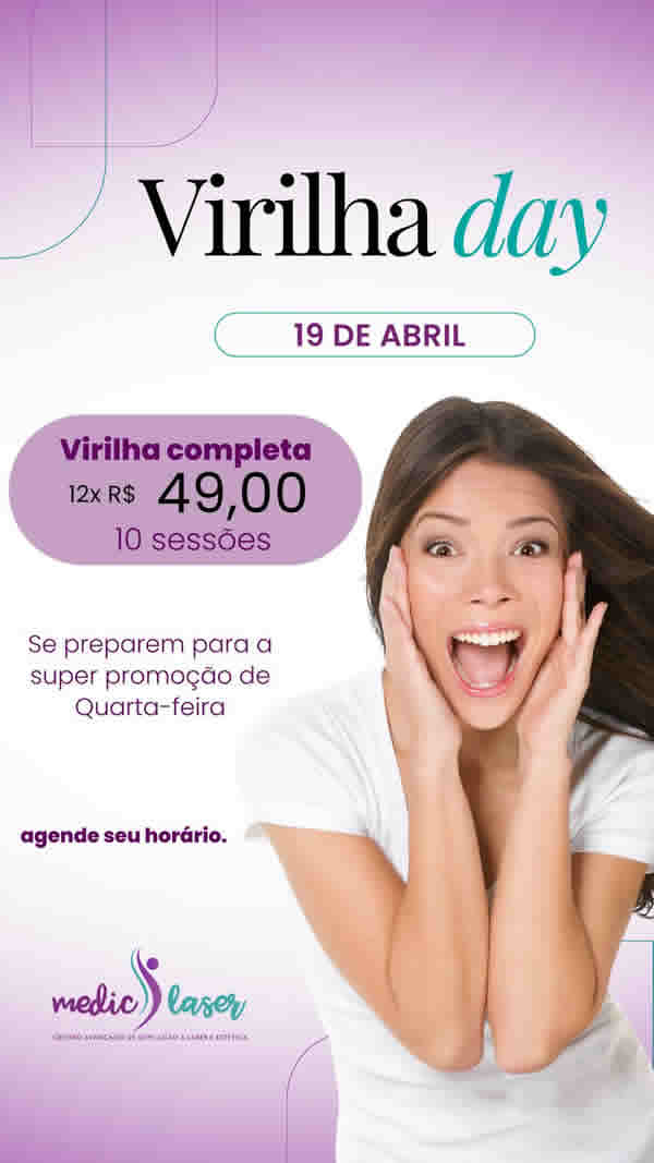 Somente nessa quinta-feira 20/04 VIRILHA COMPLETA por apenas: 12x R$49,00! Somente na Medic Laser você tem o resultado que procura e profissionais capacitados para melhor te atender! Venha com a gente nessa quinta de promoção!!! Estaremos te esperando!! Entre em contato conosco para agendar seu horário: (32) 99867-6662