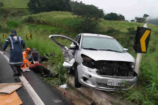 Carro sai da pista e quase cai em ribanceira na BR-116, em Muriaé
