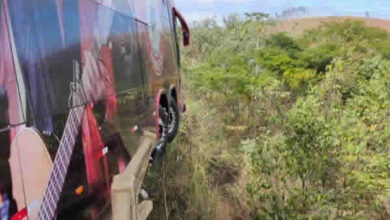 Ônibus da dupla César Menotti e Fabiano fica pendurado sobre ponte após batida com carreta